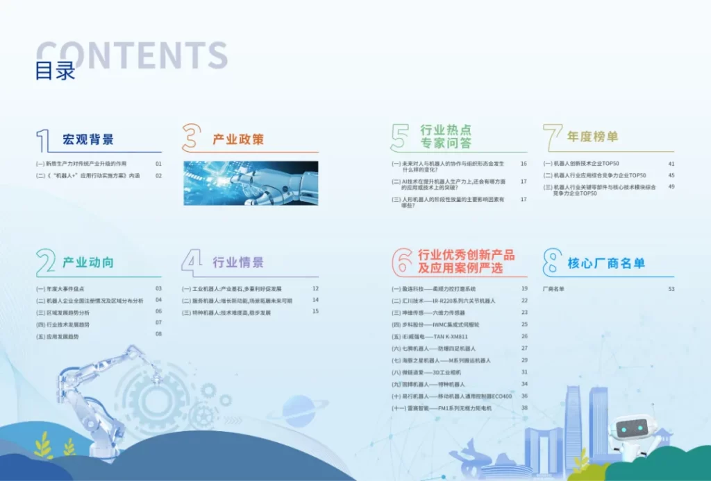 这本蓝皮书由八个部分组成: 宏观背景、行业背景、行业政策、行业前景、行业专家问答、行业优秀创新案例和应用案例汇编、年度排行榜、核心制造商名单.基于对终端应用和相关供应企业的精准数据调研,详细分析了当前 "机器人+"行业应用的主要产品应用特点,并发布了 优秀企业名单.同时,它还预测 机器人+"行业应用的未来热点应用领域、未来市场升级需求空间及趋势。